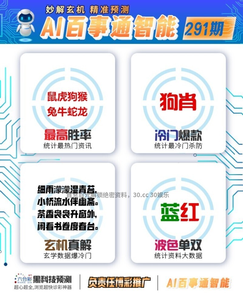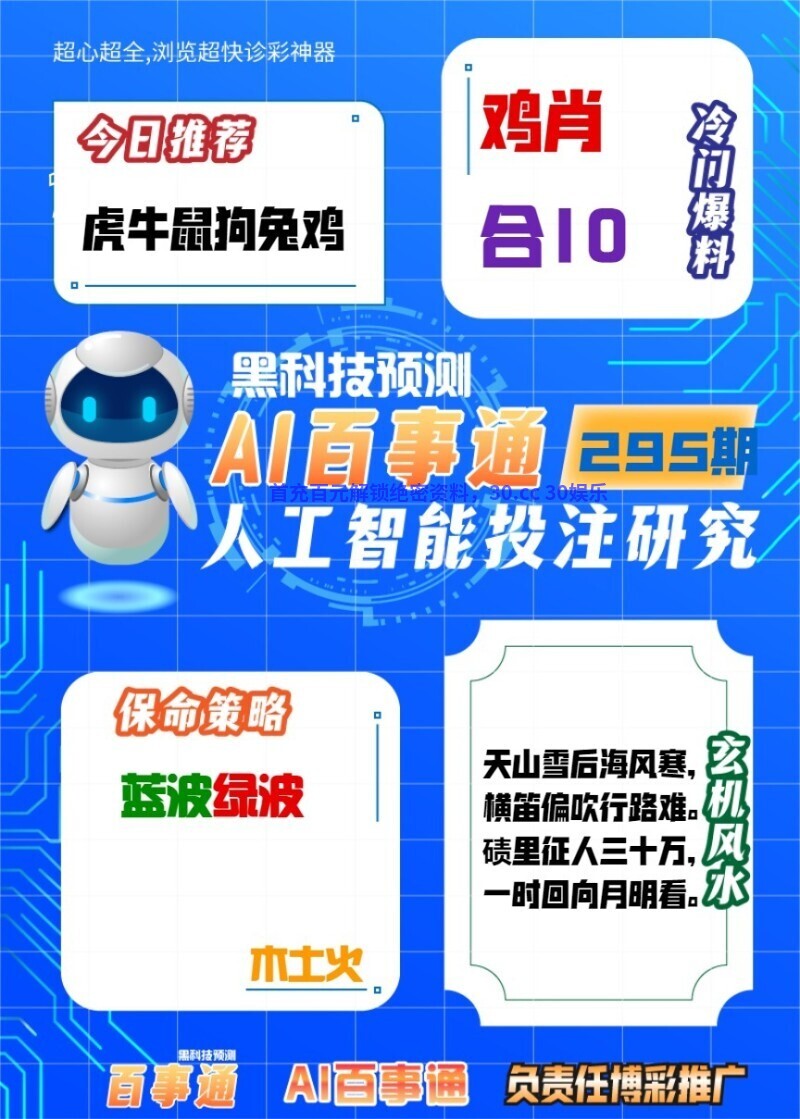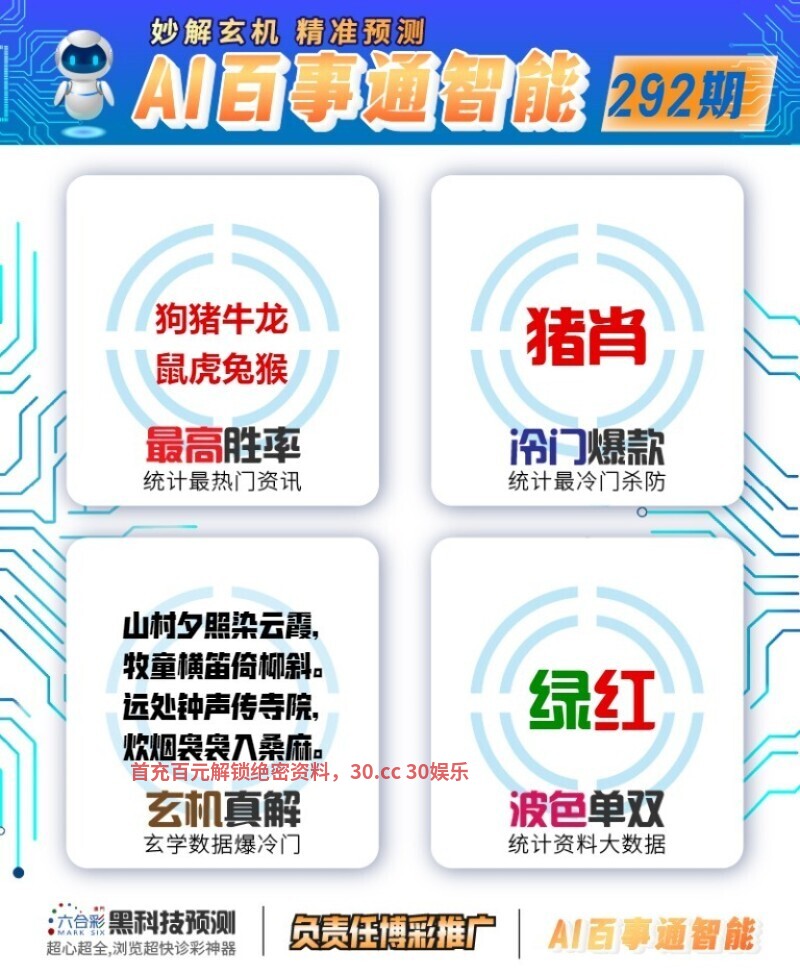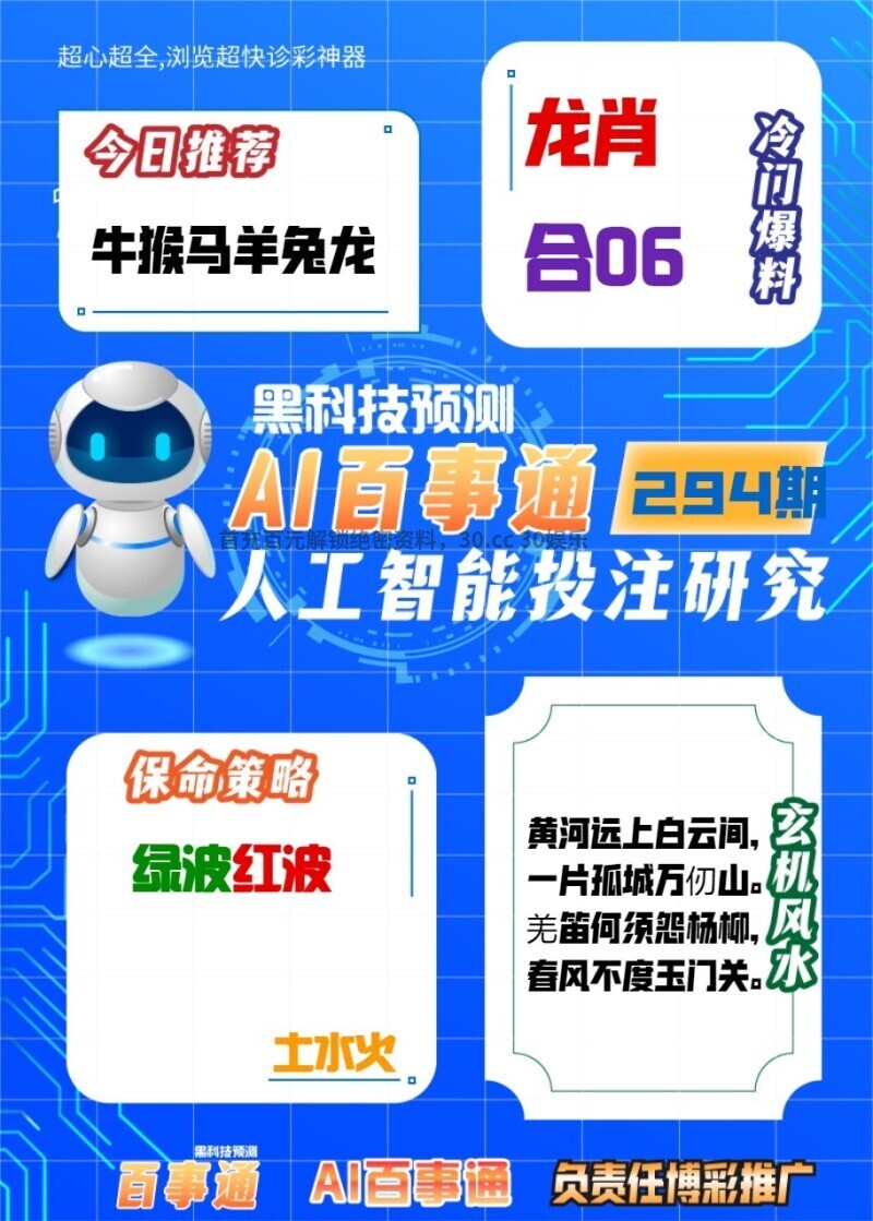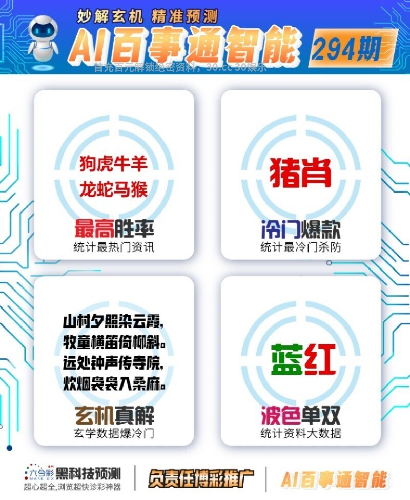 294期:AI百事通 诗:山村夕照染云霞,牧童横笛倚柳斜。远处钟声传寺院,炊烟袅袅入桑麻。 玄机真解:山村夕照染云霞,牧童横笛倚柳斜。远处钟声传寺院,炊烟袅袅入桑麻。解狗蛇鸡猪鼠龙 爆款六肖:狗蛇鸡猪鼠龙 |